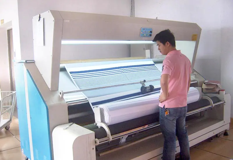 Inspection and testing of fabrics upon arrival in house: Will check every roll of fabric by checking machine, using 4 points checking method, to make sure fabric received are without defects .
