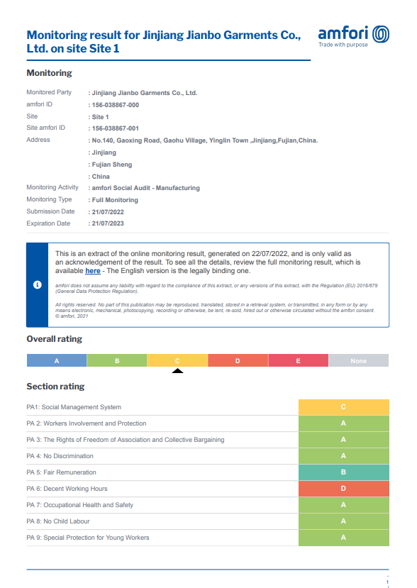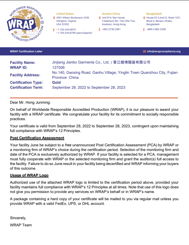 We have QC team to be in factory all the time. In-line checking to make sure good quality, final inspection to make sure bulk quality up to AQL 2.5 standard.