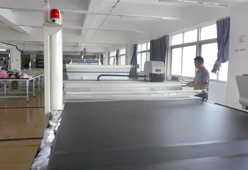 Cutting: Based on different request, we will cut fabric by hand or by machine. For knitted wear which need precise on sizing, we will use auto cutting machine to cut. Using auto puller to pull and lay fabric on cutting bed, vacuum under the table will suck the fabric up which fix layers of fabric on the tabel, allowing auto cutting machine to cut precisely.